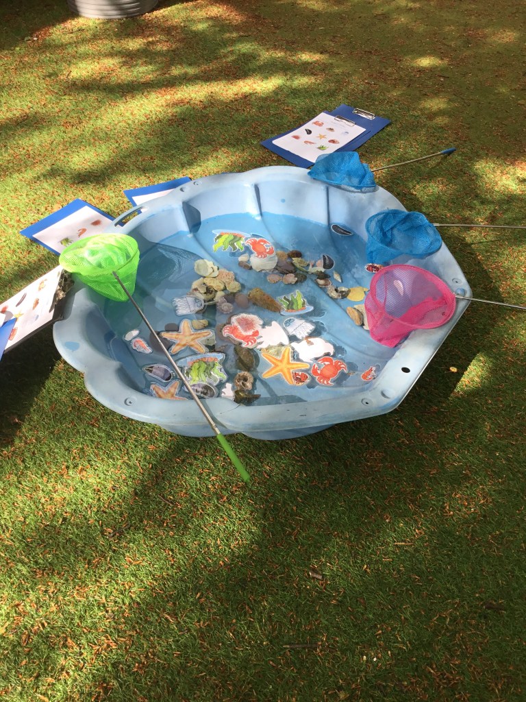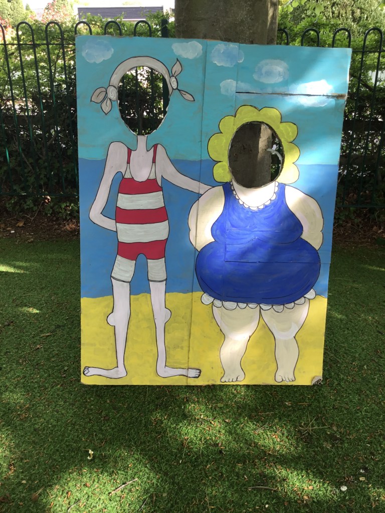 We are ready to welcome the children into school this morning with lots of seaside games to enjoy. There’s a hook a duck, a buzzer challenge, a paddling pool, a rock pool to go dipping in, a tin can alley, props to pose behind, a cosy area to read a book in, a hoopla and (that well known seaside activity) welly wanging!